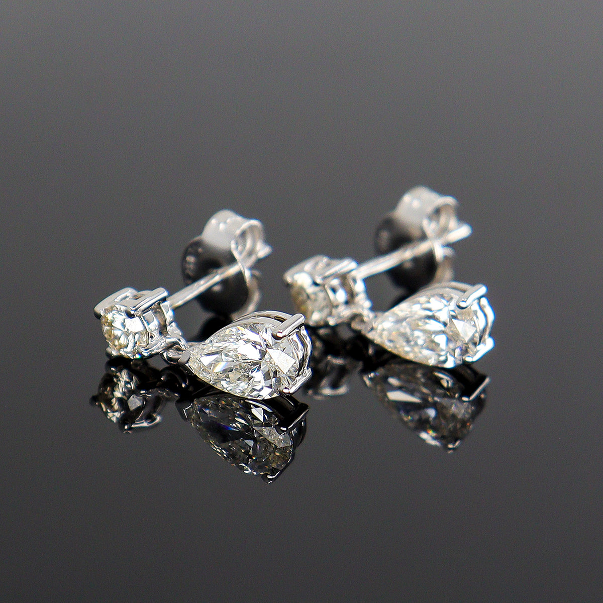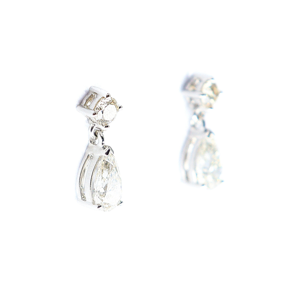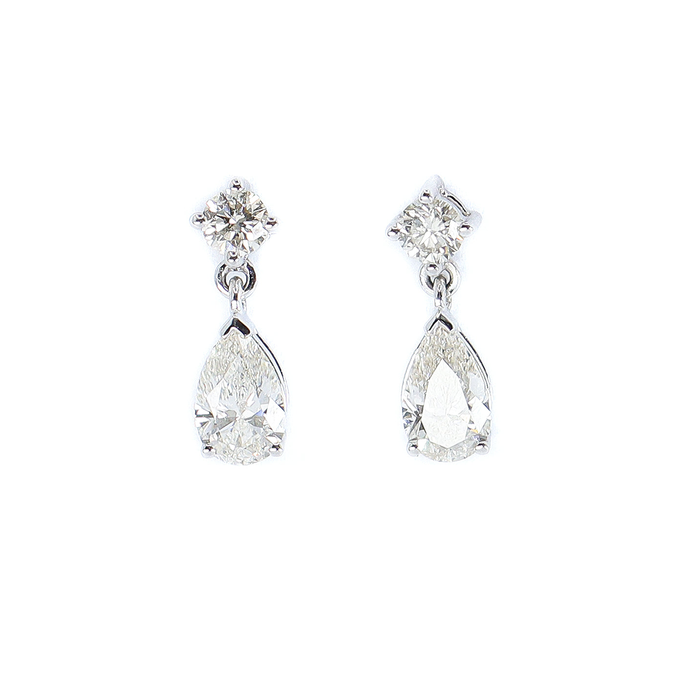 Dazzling pear cut diamonds, delicately dangle in a droplet style from a round brilliant cut diamond stud. All set within highly polished 18ct White Gold in a claw setting, with post and butterfly, these drop earrings are timeless in their design.