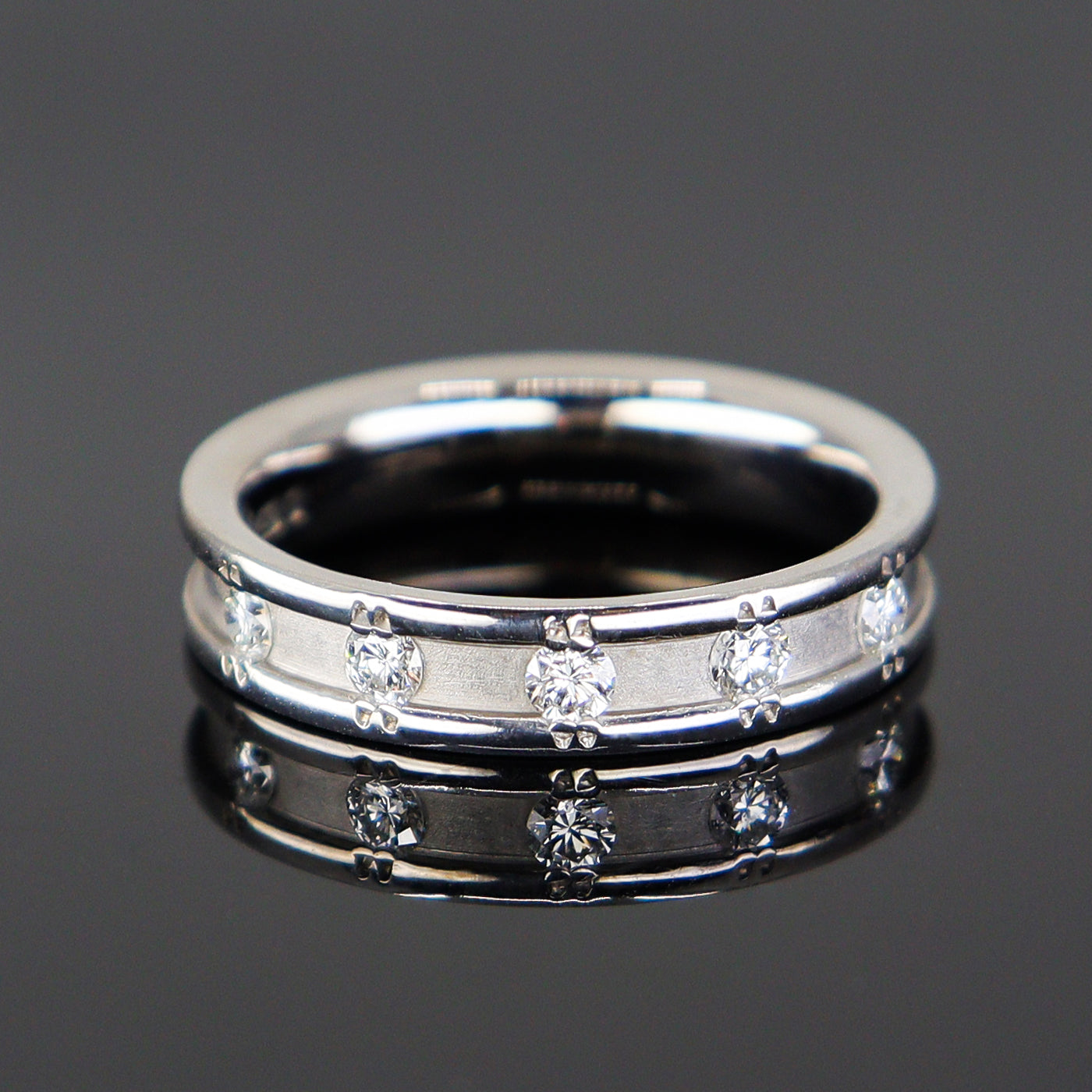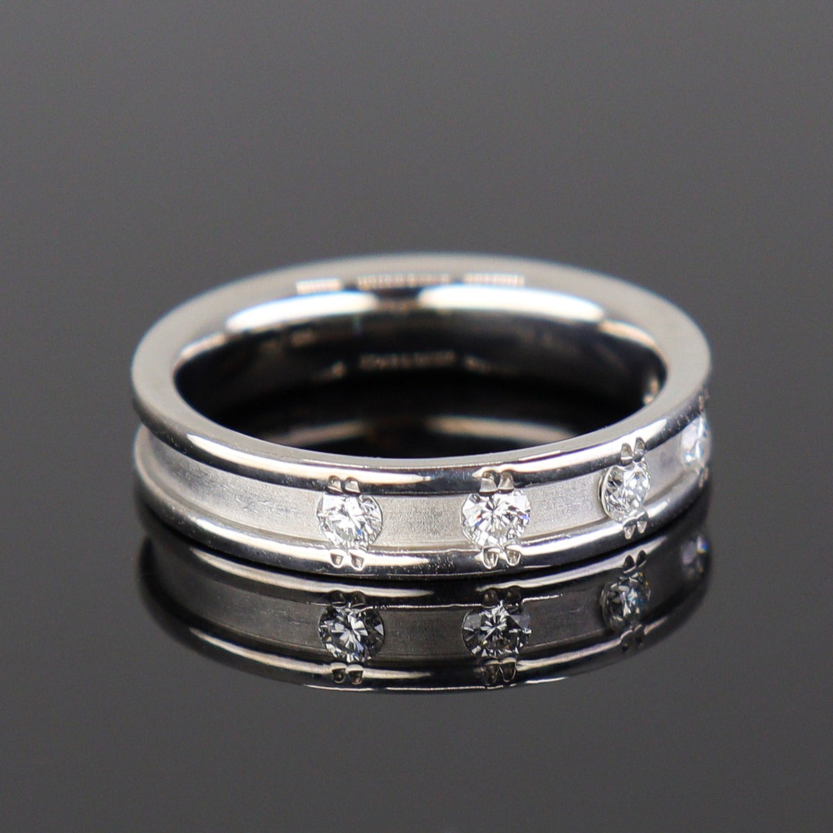 Discover Chatfields hand selected collection of beautiful Diamond and Gemstone Pre-Owned Jewellery. A beautifully crafted sparkling Diamond set band, with lots of personality. Five Brilliant Cut Diamonds sit with a satin polished band of 18ct White Gold and are highlighted by raised, highly polished track lines. This 4mm band is comfort-fit, meaning it is rounded on the inside of the band for additional wearability and is wed-fit.
