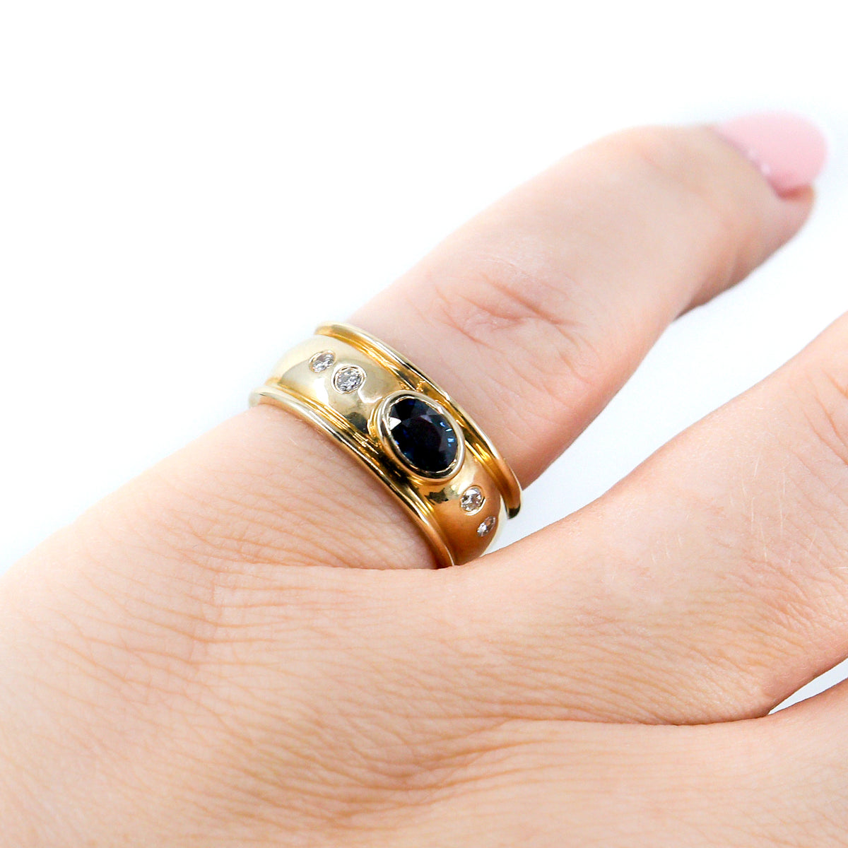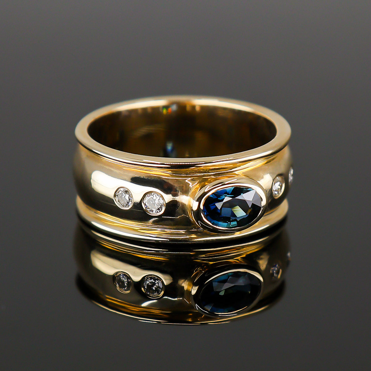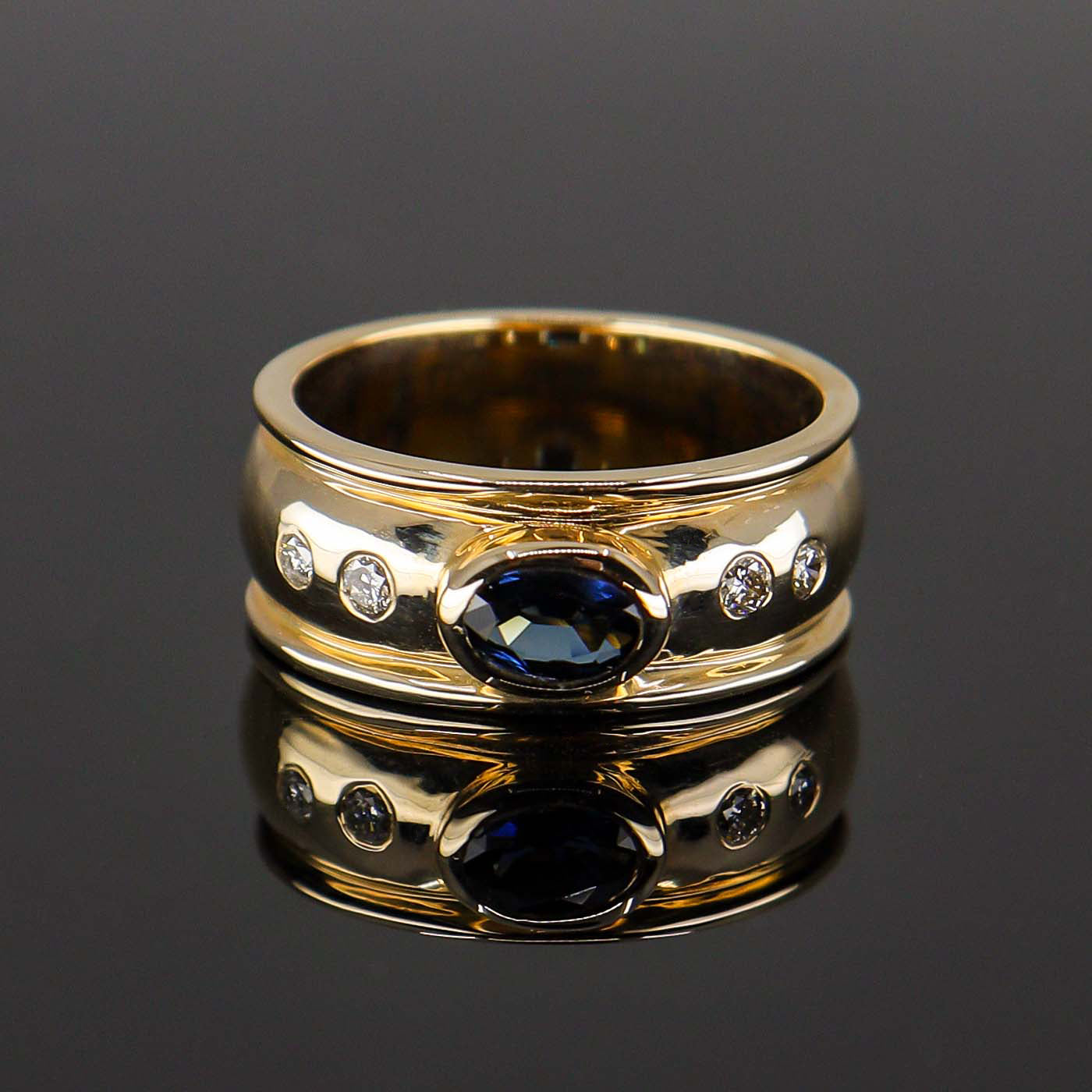 Discover Chatfields hand selected collection of beautiful Diamond and Gemstone Pre-Owned Jewellery. Bold yet elegant, this 9ct Yellow Gold wide band ring features a striking oval-cut deep blue sapphire at its centre, rubset for a sleek and secure finish. Accented with shimmering round brilliant cut diamonds, each thoughtfully spaced along the band, this piece exudes contemporary sophistication. The substantial width and high polish finish give it a luxurious presence, making it a standout choice for everyday elegance or a unique statement ring.