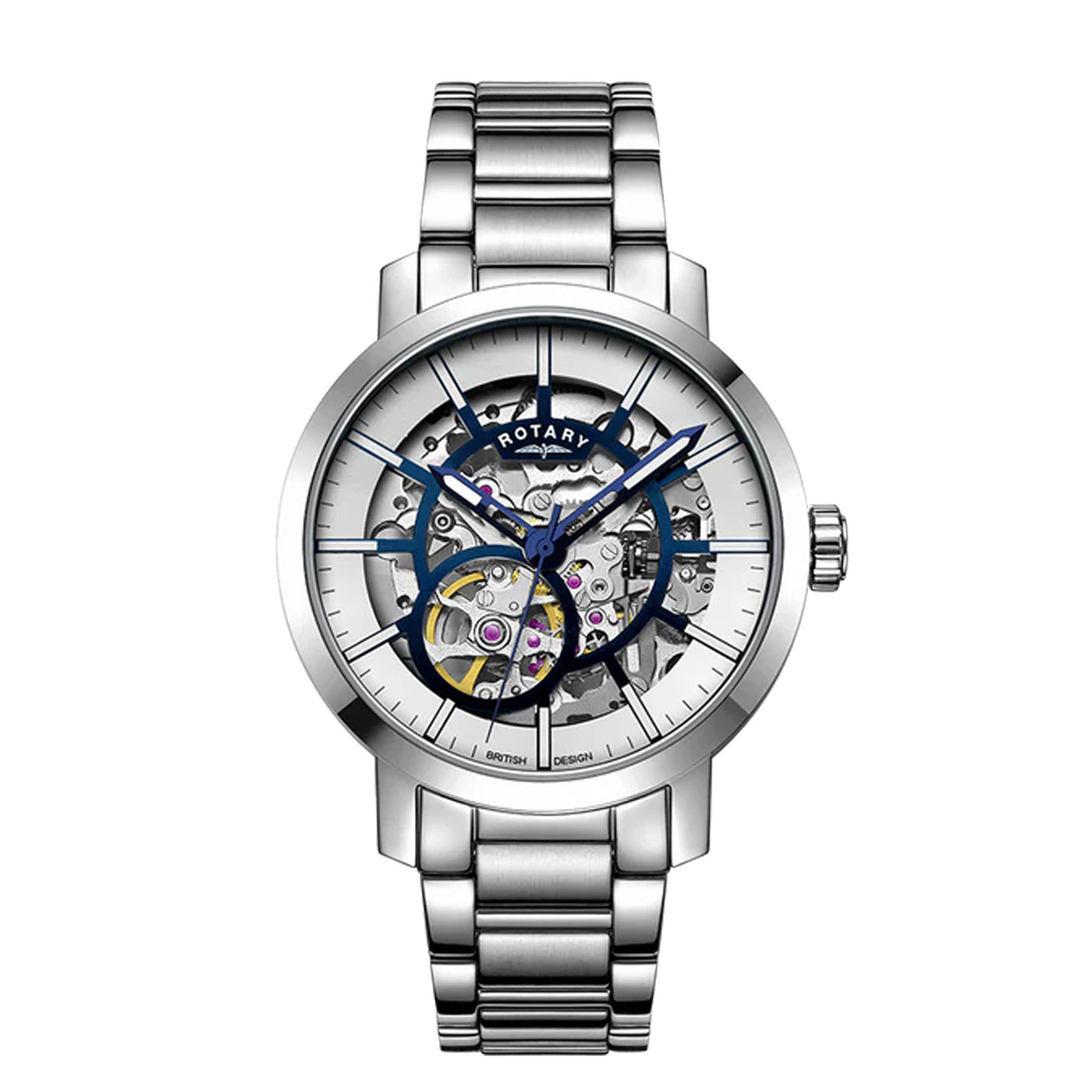 A stylish addition to your wrist. This robust skeleton watch from the Skeleton family features a stunning exposed automatic movement, a blue grid dial and luminous hour markers, encased within scratch resistant sapphire glass. Built to make an impact and sit comfortably on the wrist, the stainless steel 38mm case is framed by a strong h-link stainless steel bracelet that is secured with a deployment clasp. A robust and handsome item, this watch is water resistant to 50m.